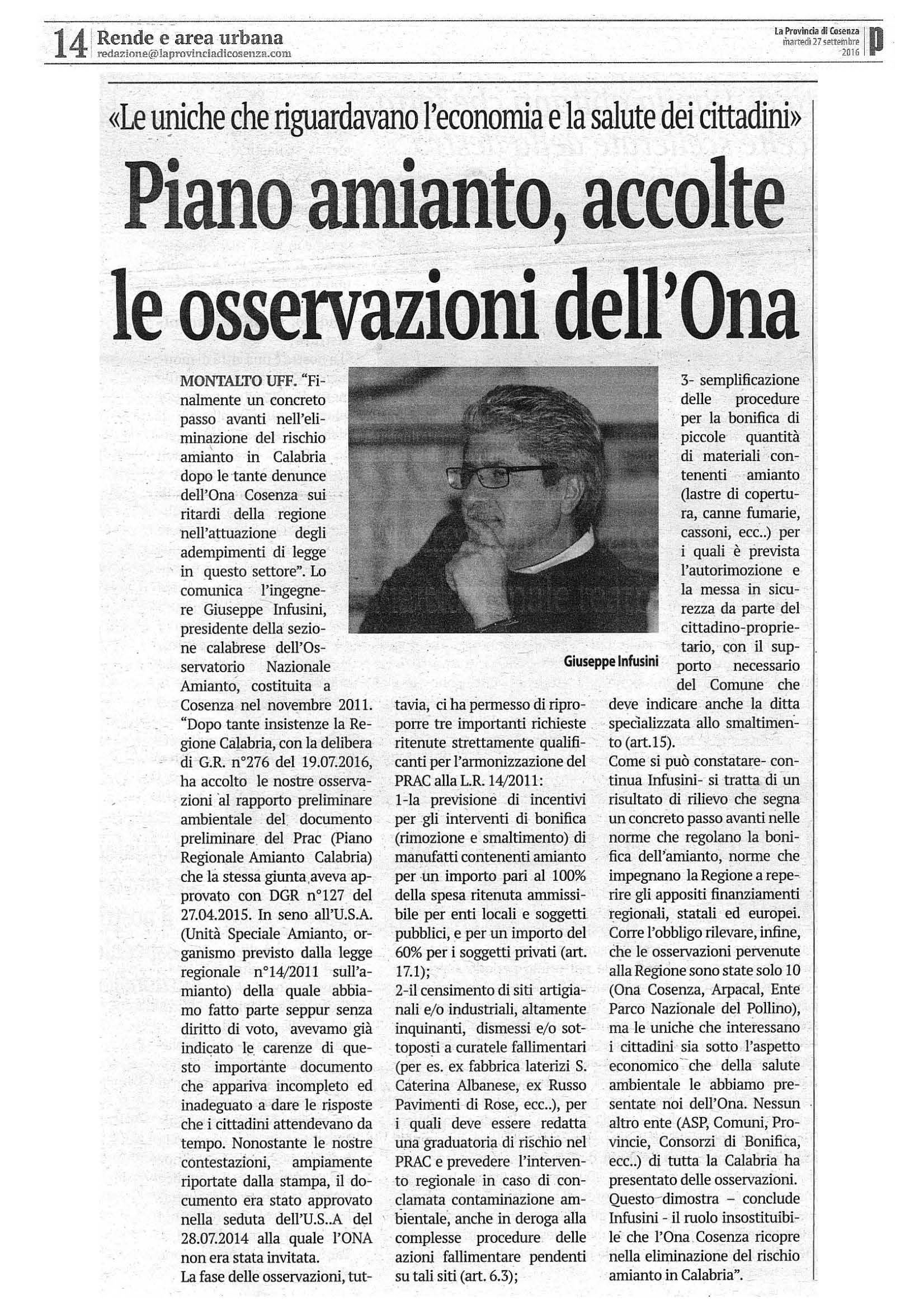 L’ing. Giuseppe Infusini spiega l’importante passo avanti nella costante lotta all’amianto da parte dell’ONA Cosenza.Le uniche osservazioni al Piano, a tutela dei cittadini, le ha presentate l’ONA Cosenza e la regione Calabria le ha accolte. La soddisfazione dell’ing. INFUSINI è¨ piè¹ che legittima.
