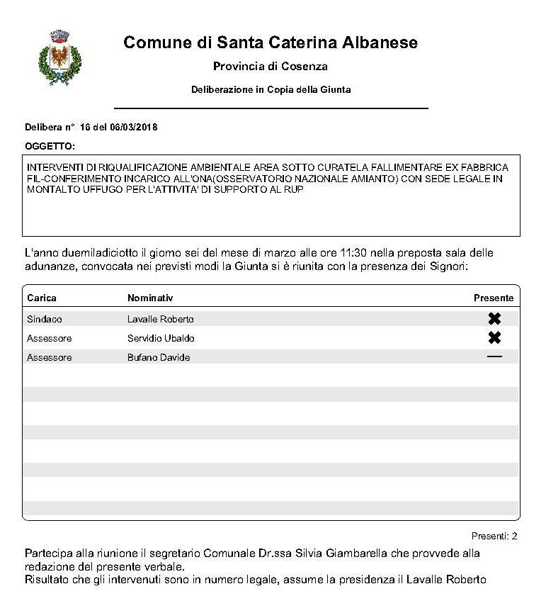 Il comune di S. Caterina Albanese, con delibera di G.M. n° 16 del 6 marzo 2018 ha conferito all’ONA Cosenza l’incarico di supporto al RUP per supervisionare i lavori di bonifica dell’ex fabbrica laterizi sita in localitè Triscioli soggetta a curatela fallimentare. Come si ricorderè l’ONA Cosenza si è¨ battuta fortemente e costantemente affinchè¨ la Regione intervenisse in questa annosa vicenda che durava da circa 25 anni. Cosa che ha fatto concedendo un contributo di € 190.000,00 il cui decreto dirigenziale di concessione citava espressamente l’ONA per aver segnalato le criticitè relative alla contaminazione ambientale del sito. Si tratta di un importante riconoscimento del nostro ruolo e delle nostre competenze sulla tutela dal rischio amianto in Calabria che ci rende orgogliosi della nostra attivitè a fianco dei cittadini e delle istituzioni.