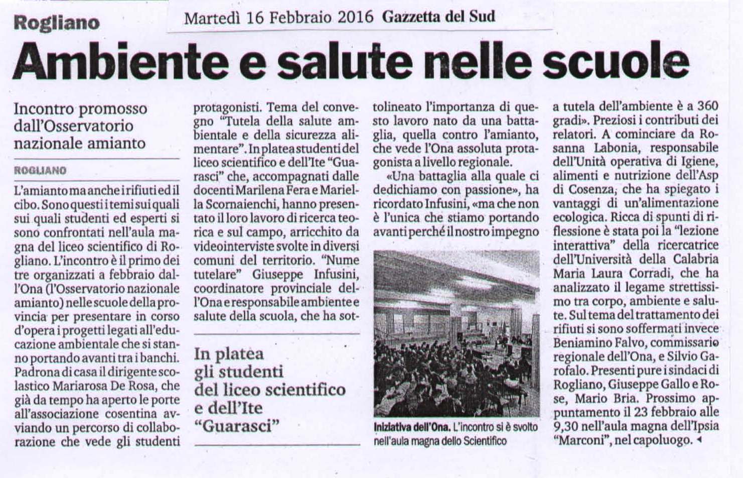 Si è¨ concluso con un successo superiore alle aspettative il primo dei tre convegni ONA nelle scuole, previsti nel mese di febbraio, sul tema dell’educazione ambientale, facente parte del progetto approvato di cui sè¬ è¨ data notizia nelle precedenti news, sostenuto anche dall’Ufficio Scolastico Provinciale. L’articolo della Gazzetta del Sud riporta gli esiti del convegno del 13.02.2016 svoltosi a Rogliano, presso il Liceo Scientifico – ITE.