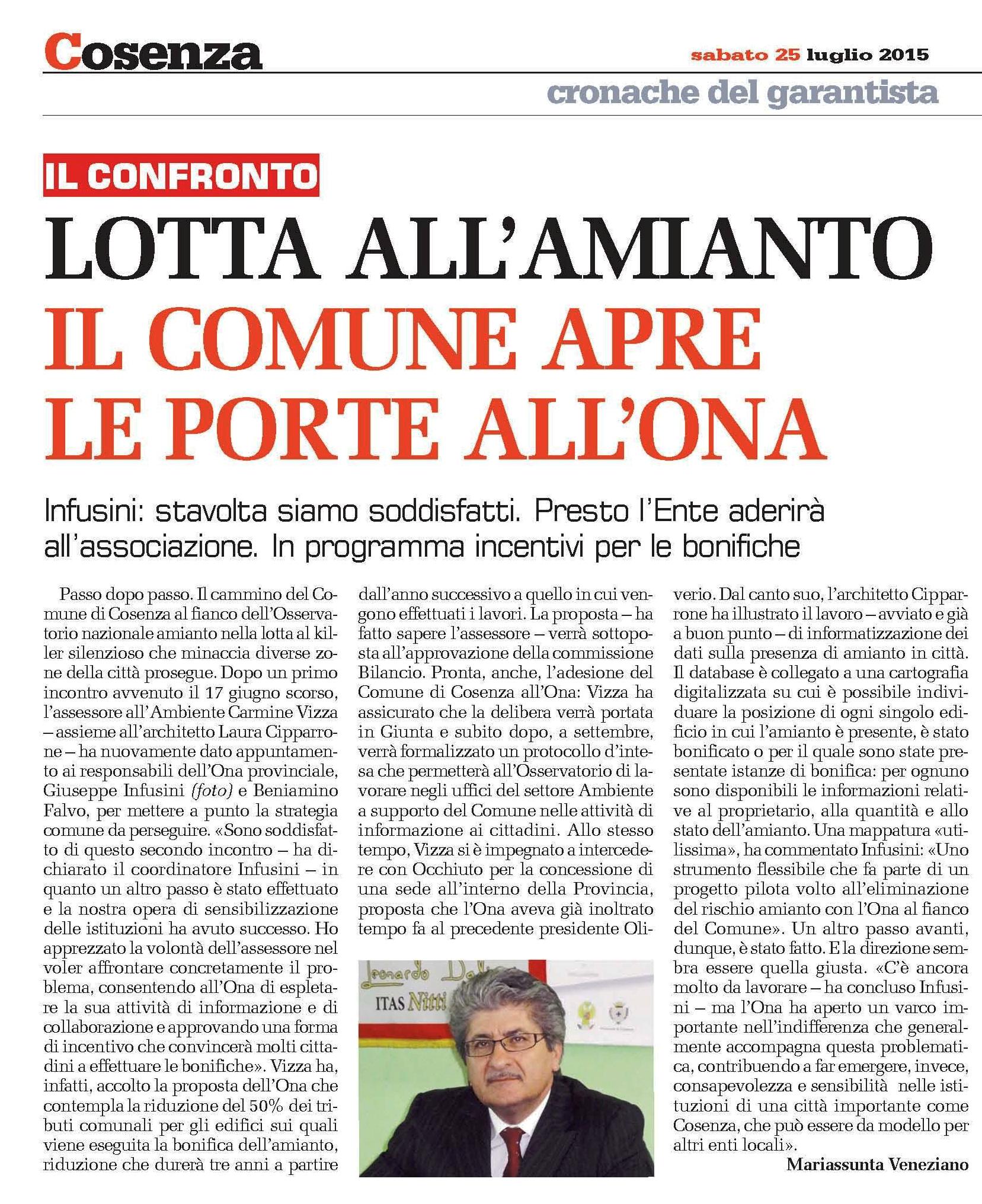Una seconda riunione si è¨ svolta tra la nostra ONA e l’Ass.re alla Sostenibilitè Ambientale del Comune di Cosenza, dott. Carmine Vizza. Siamo soddisfatti per aver sensibilizzato la nostra Cittè di Cosenza a prendere in seria considerazione la problematica amianto. Particolarmente importante, in assenza di risorse finanziarie, l’applicazione dell’incentivo da noi proposto e fatto proprio dall’assessore: abbattimento dei tributi finanziari (per es. IMU) del 50% per tre anni a chi effettua le bonifiche di materiali contenenti amianto amianto. Inoltre l’ass.re Vizza (che porterè nella prossima giunta la delibera di adesione alla prossima giunta) a stipulare in settembre il protocollo d’intesa che permetterè agli esperti ONA di assumere funzioni di supporto all’ufficio del settore ambiente che si occupa di amianto, con ciè² riconoscendo la nostra competenza ed operativitè . Una grande soddisfazione, dunque, per tutta l’Associazione!!! A soli tre anni dalla sua istituzione, l’ONA Cs ha aperto un varco nell’indifferenza degli enti verso questa minaccia ambientale e Cosenza, con il suo impegno insieme all’ONA, puè² essere da modello a cui riferirsi per affrontare concretamente la lotta all’amianto.