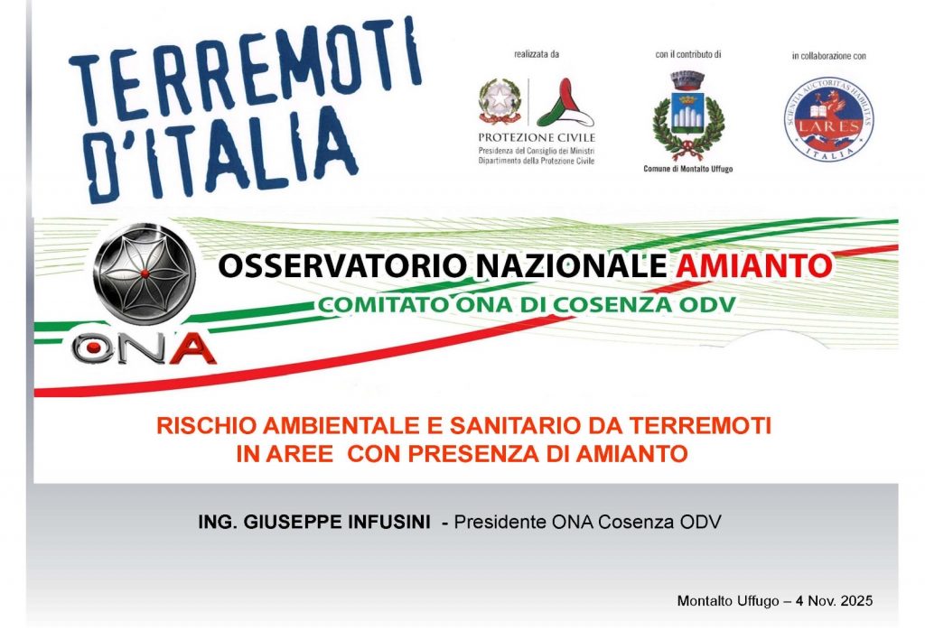 Il Presidente dell’ONA Cosenza ing. Giuseppe Infusini terrà un importante seminario sul tema “Rischio ambientale e sanitario da terremoti in aree con presenza di amianto” che si svolgerà a Montalto Uffugo giorno 4 novembre 2025 con inizio alle ore 15.30 presso la ex sede della Fincalabria, località Pianette. Il seminario è stato incluso nel programma della mostra itinerante “Terremoti d’Italia” promossa dal Dipartimento della Protezione Civile – Presidenza del Consiglio dei Ministri ed organizzata dal dall’Ufficio di Protezione Civile del comune di Montalto Uffugo di cui è Responsabile il geol. Mirco Taranto. Oltre che a promuovere la cultura della tutela dal rischio amianto, nel corso del seminario verranno illustrati gli ulteriori rischi ai quali verrebbe esposta la popolazione in caso di eventi sismici che interessano aree con edifici in cui sono presenti manufatti in cemento amianto. Stante l’importanza degli argomenti che verranno trattati, si invitano i soci dell’ONA Cosenza e la cittadinanza tutta a partecipare all’evento.