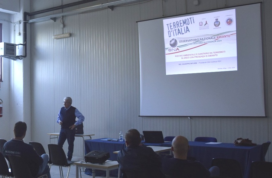 Nel corso del seminario tecnico svoltosi il 4 novembre 2025 a Montalto Uffugo, nell’ambito degli eventi “Terremoti d’ Italia”, l’ingegnere Giuseppe Infusini ha illustrato il problema ancora attuale della presenza di amianto negli edifici, sottolineando come, in caso di terremoti, il danneggiamento di strutture contenenti questo materiale possa liberare fibre pericolose, mettendo a rischio operatori e cittadini. A seguito del suo intervento è nata una riflessione condivisa sul fatto che, durante le emergenze post-sisma, gli operatori spesso non vengono informati del potenziale rischio amianto e quindi non adottano le dovute precauzioni. Da qui l’invito a migliorare la mappatura, la comunicazione e la formazione per garantire interventi più sicuri nelle aree colpite da terremoti.