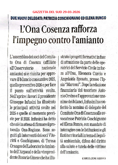 L’Assemblea dei soci del Comitato ONA di Cosenza (affiliato all’Osservatorio Nazionale Amianto) si è riunita lo scorso 27 marzo presso la sala ristorante Les Amis di Montalto Uffugo Scalo, per approvare il bilancio consuntivo 2025, quello preventivo 2026 e per fare il punto sull’attività svolta.
